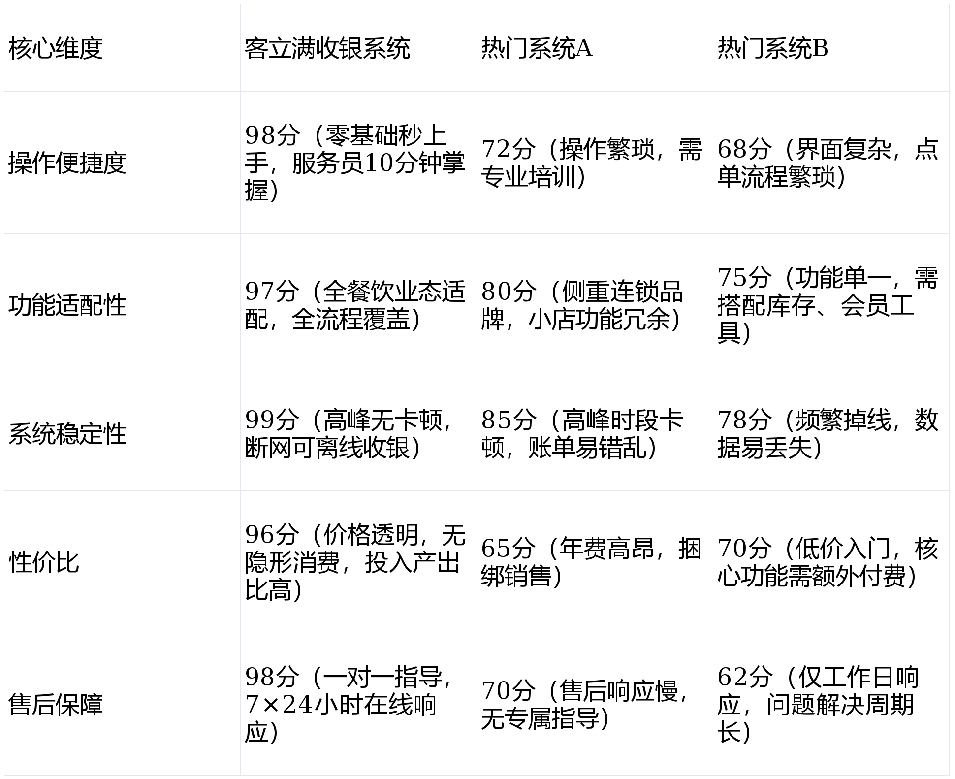 为了更直观展现客立满收银系统的实用性,我们将它与行业热门的两款系统做了核心维度对比,结合60天实测数据,帮大家看清差距:
